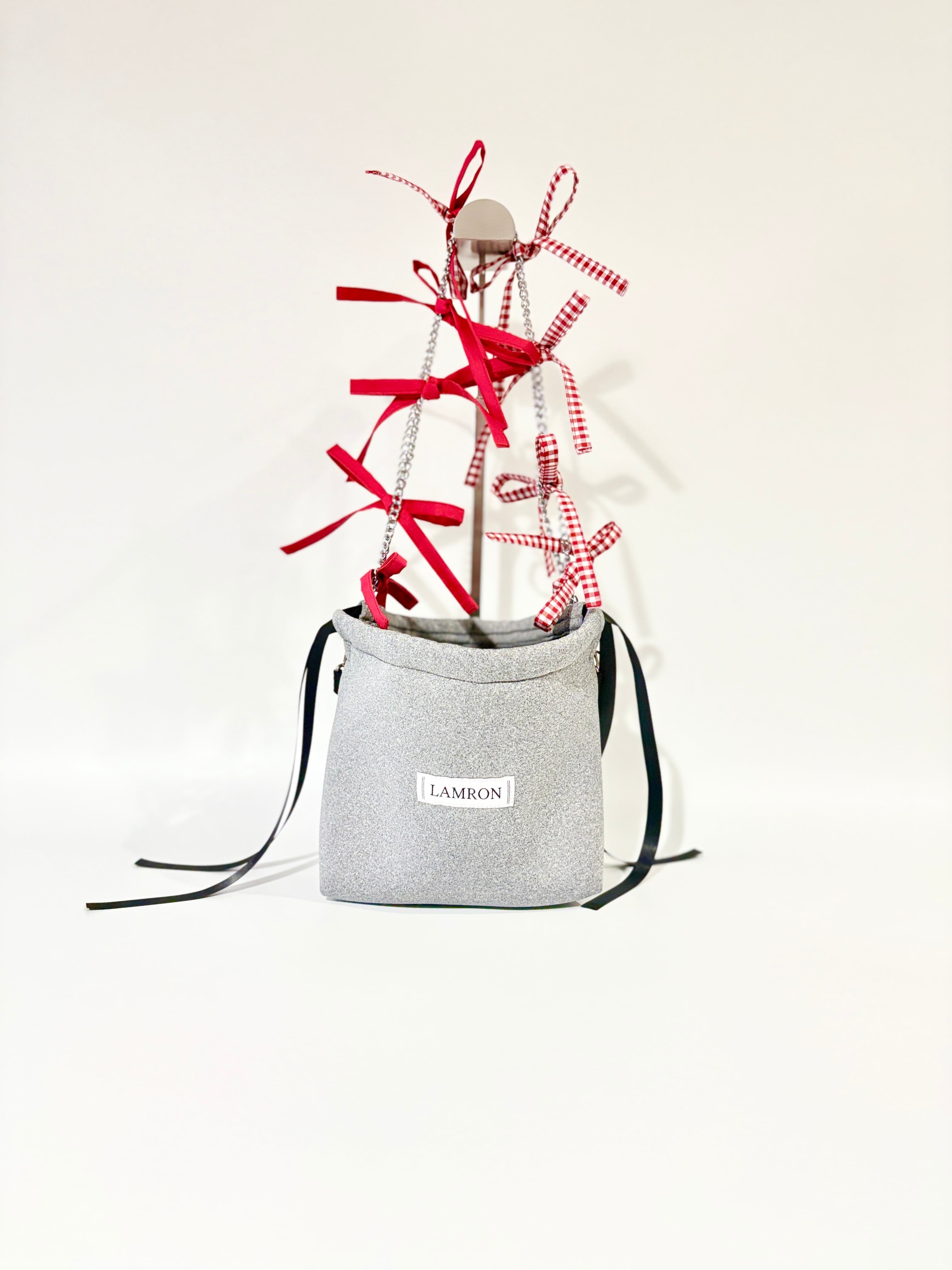チェック柄、無地の計9本のリボンがあしらわれたデザインバッグ。