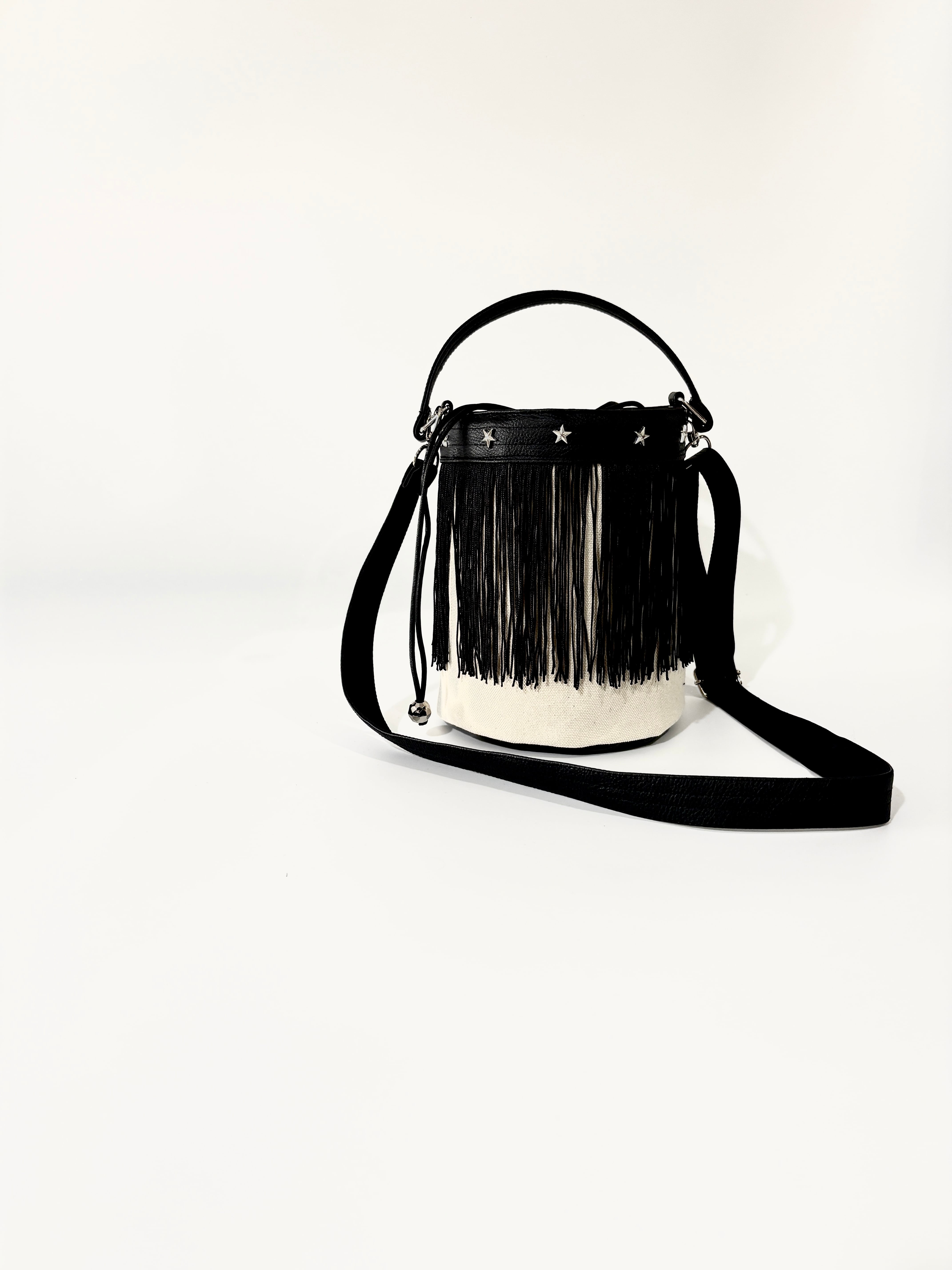 歩くたびに揺れる長く繊細なフリンジと星型studsなどのメタルパーツのコンビネーションはまるでアクセサリーをまとっているかのような華やかなデザイン