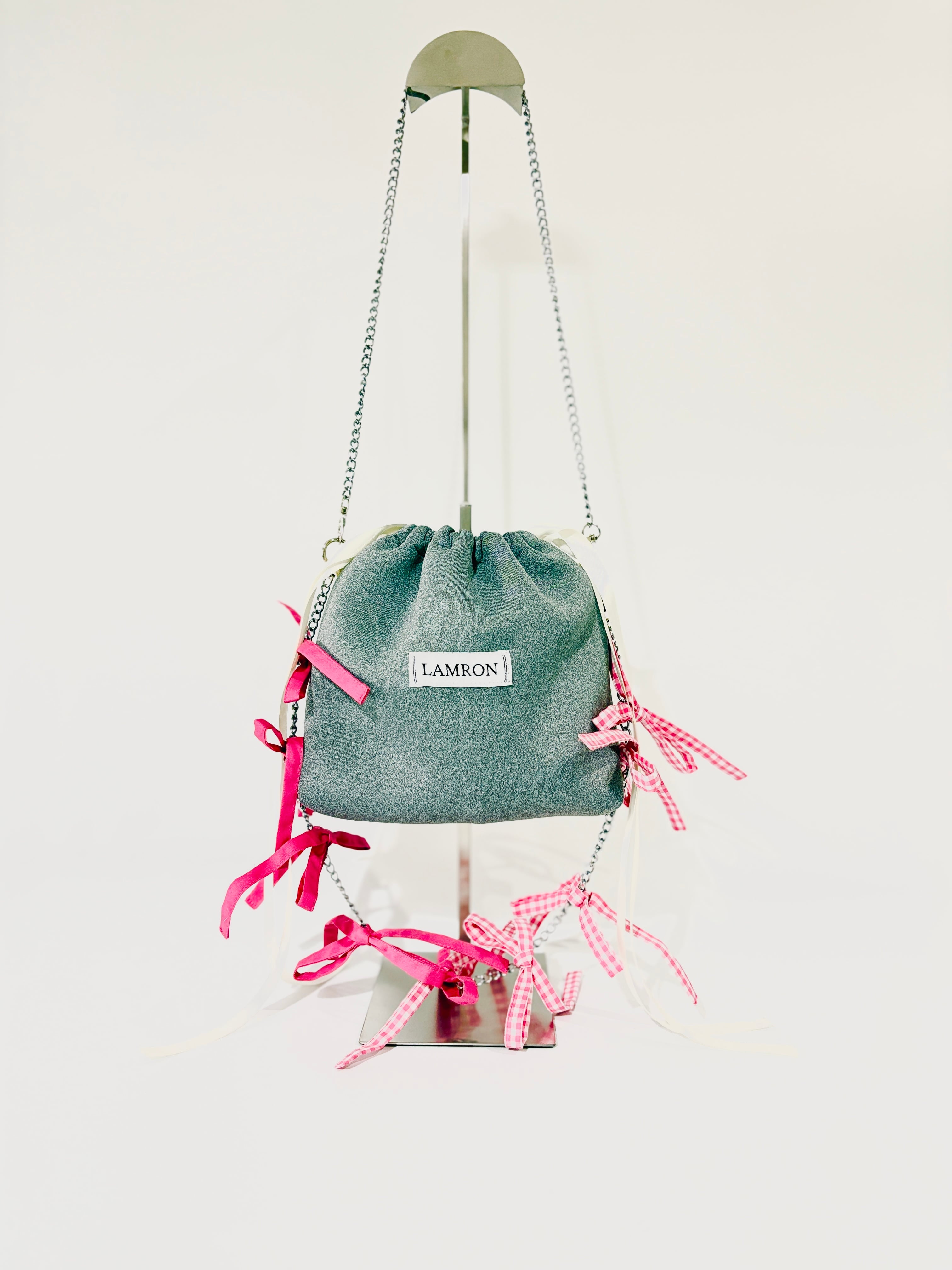 チェック柄、無地の計9本のリボンがあしらわれたデザインバッグ。