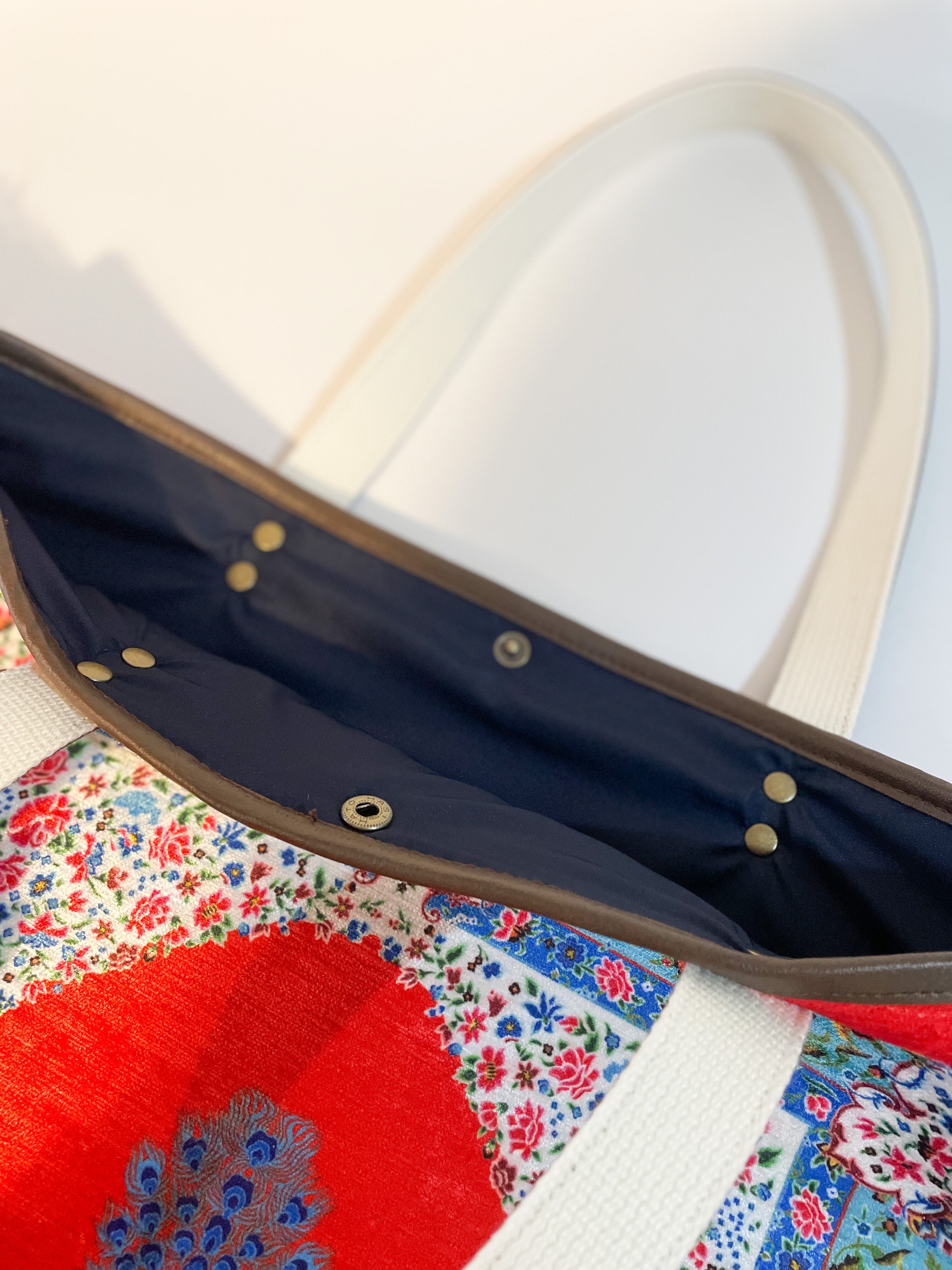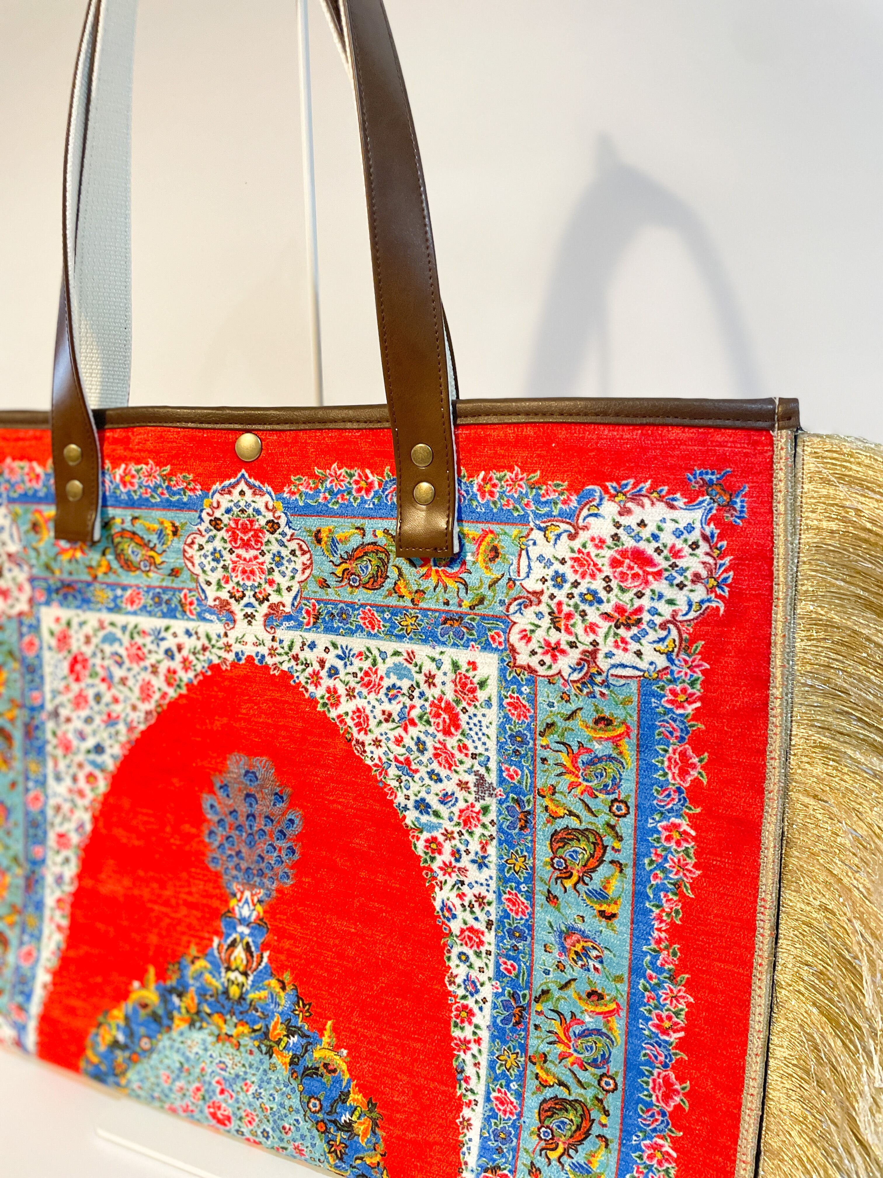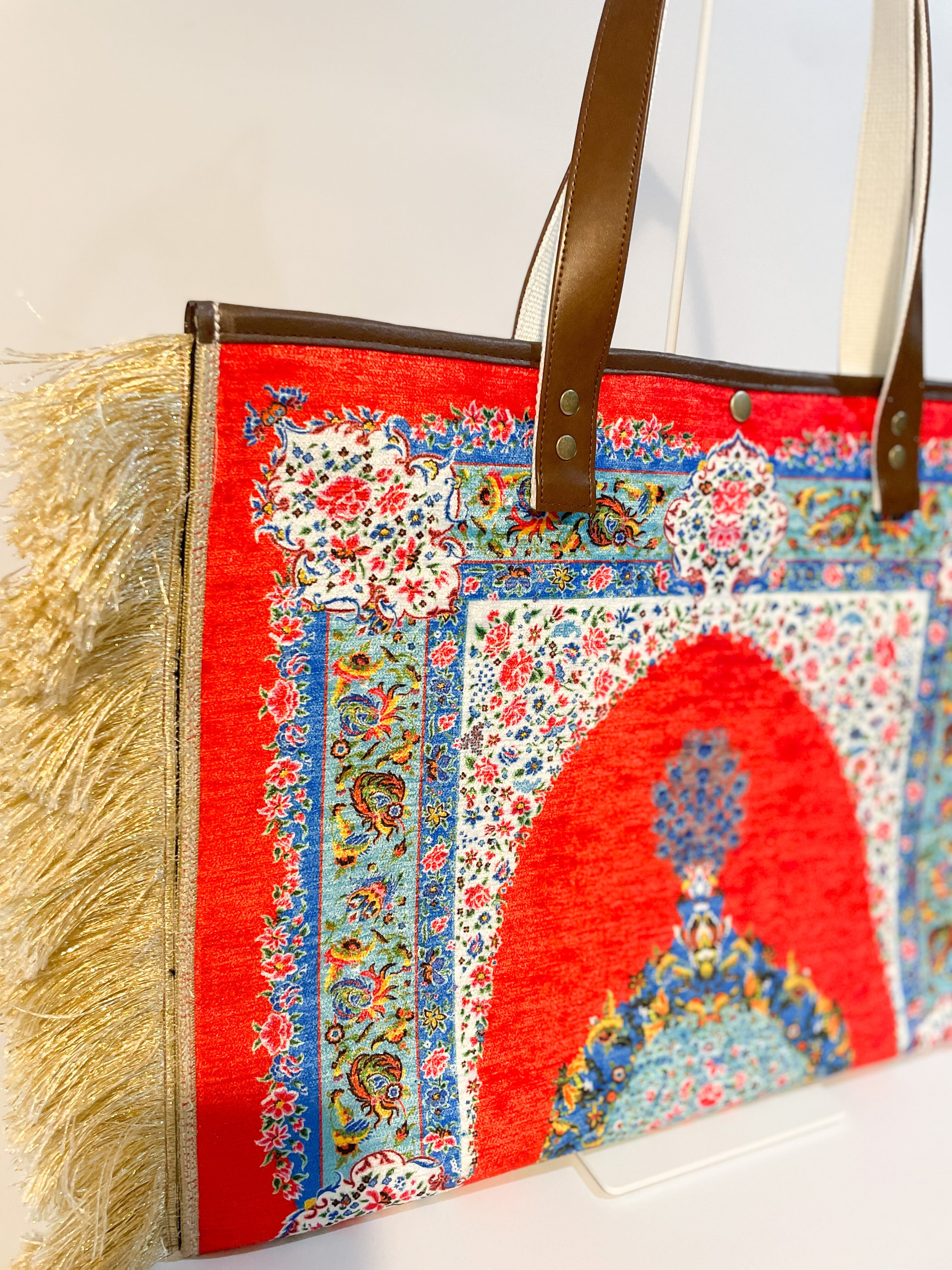 鞄 カバン バッグ バック トルコ トルコ柄 トルコ模様 フリンジ ゴールド トートバッグ ショルダーバッグ 高級感 大容量バッグ 大容量 スナップボタン ドットボタン バネホック カシメ アンティークゴールド アンティーク 絨毯 マット ポケット 革 合皮