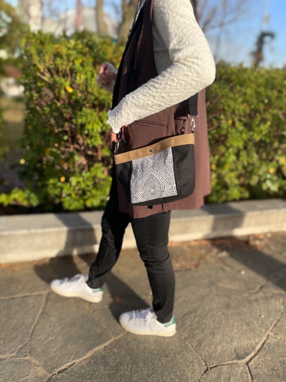 着こなしのポイントになる色柄、コンパクトだけどお出かけに必要な最低限のモノがちゃんと入って、斜め掛けや肩掛けができます。