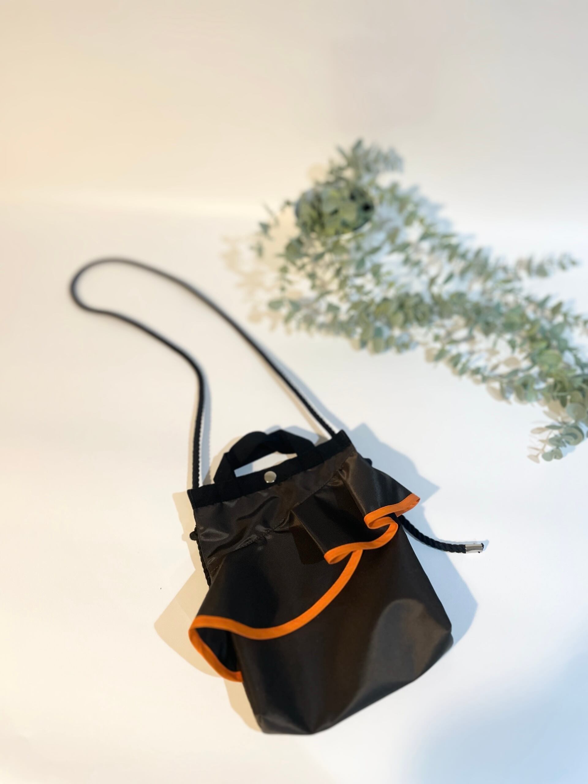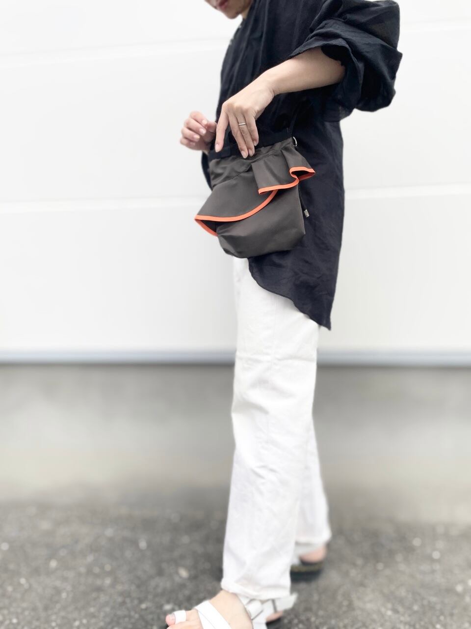 スポーティ素材とエレガントフリルが融合し絶妙なバランスでつくられたポシェット。