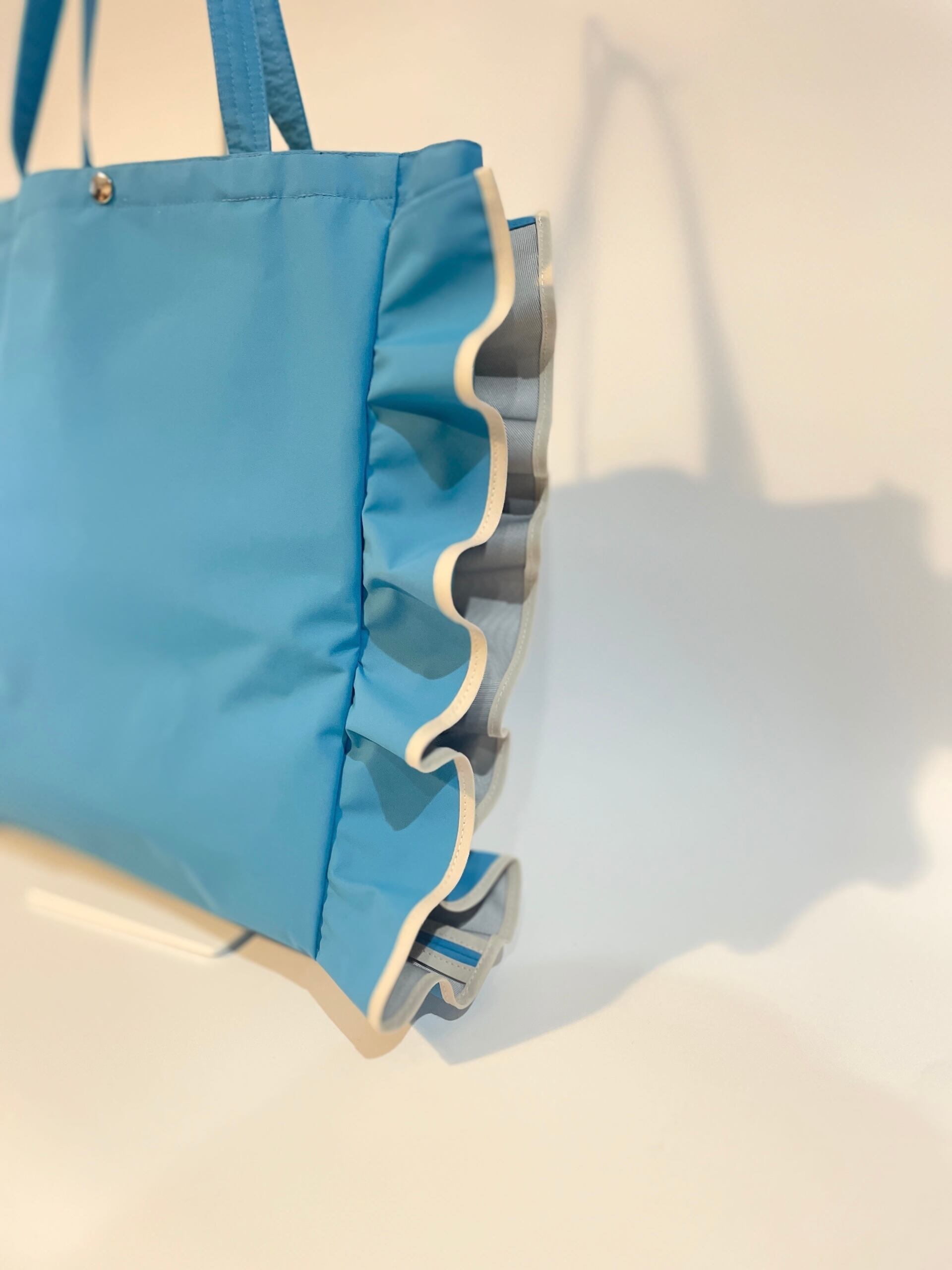 軽くて丈夫なナイロン生地を使用し、両サイドにU字にフリルをあしらったデザインのトートバッグ
