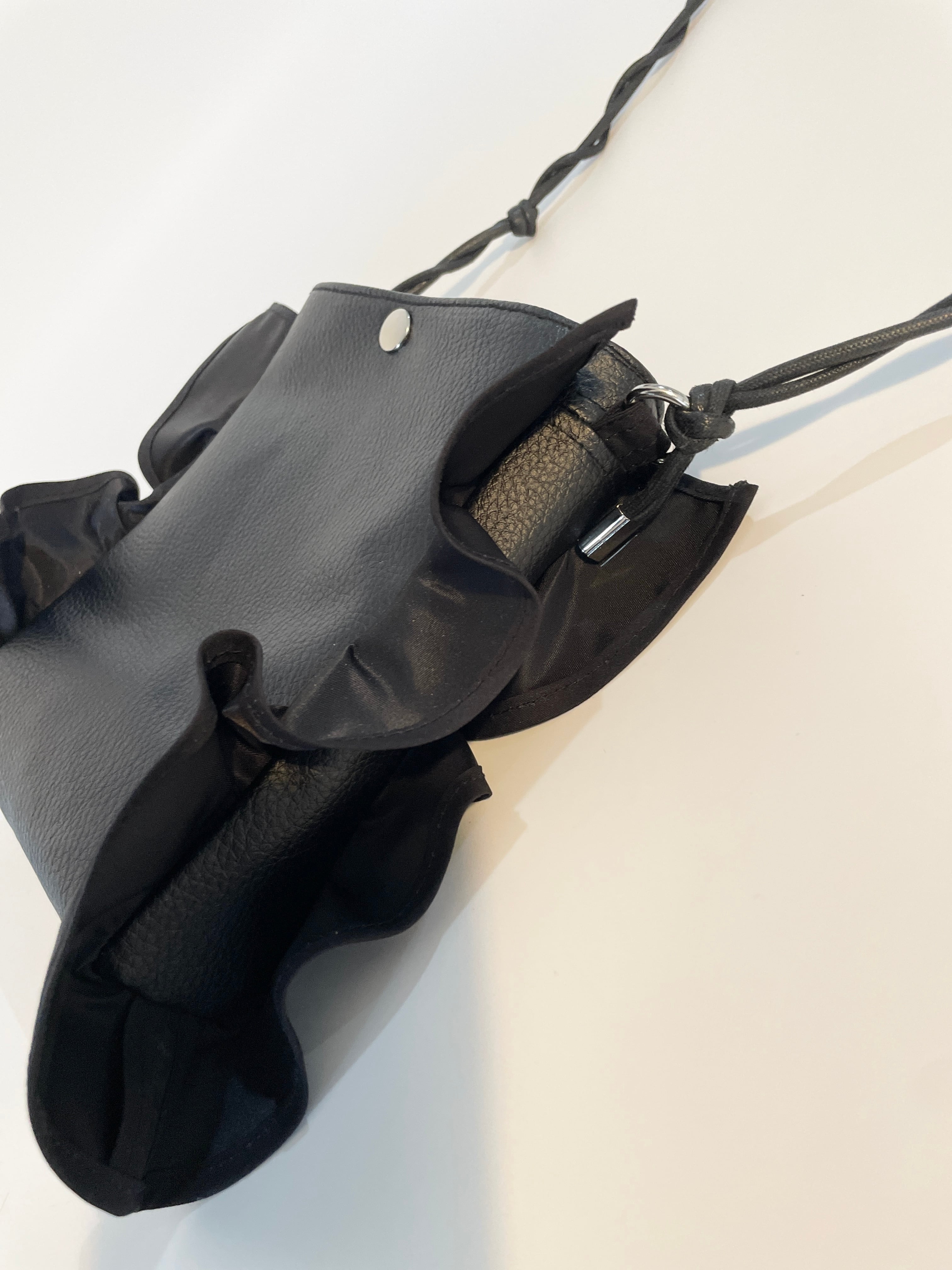 高品質エコレザーを使用し、両サイドにU字にフリルをあしらったデザイン性の高いポシェット