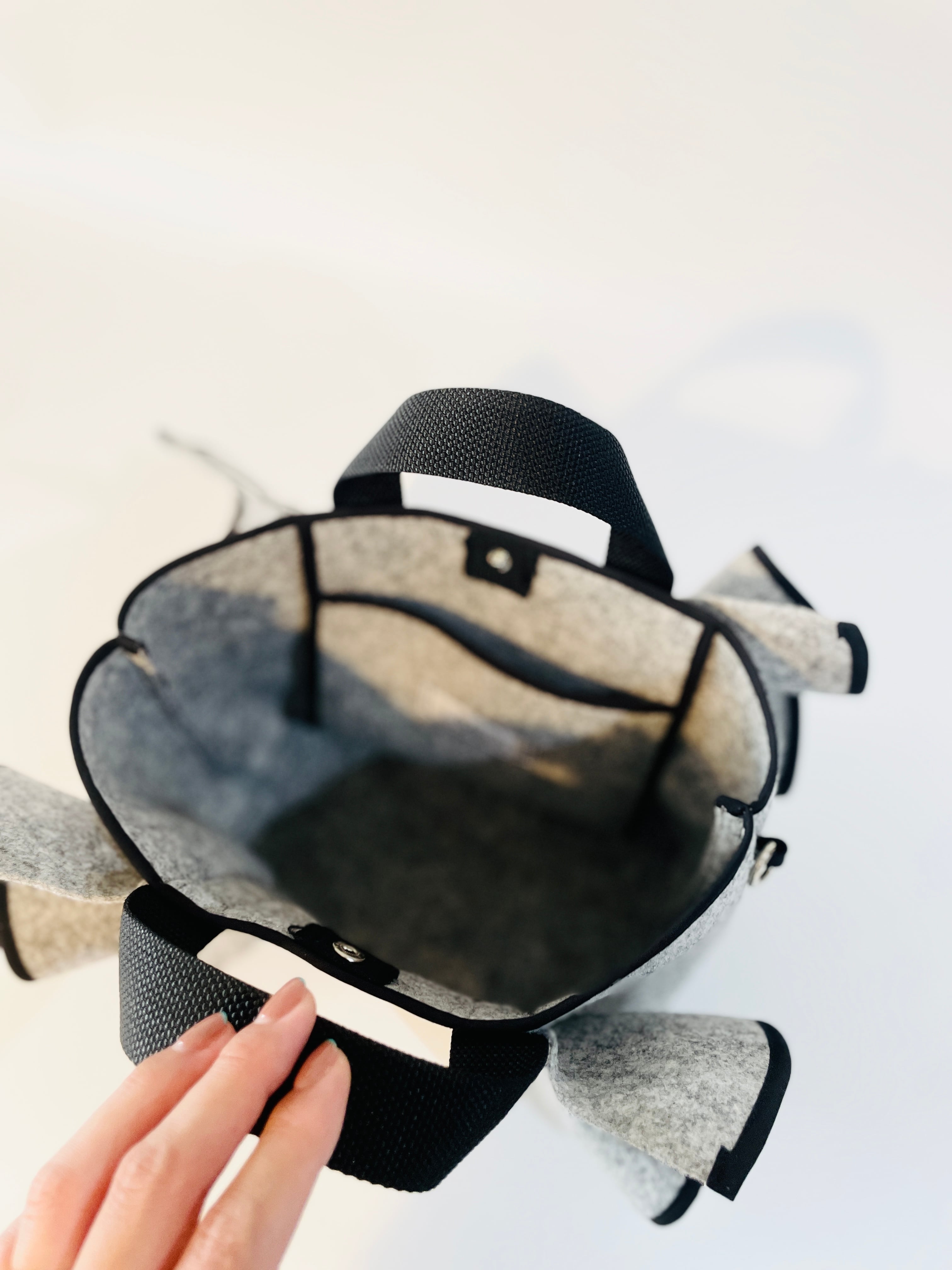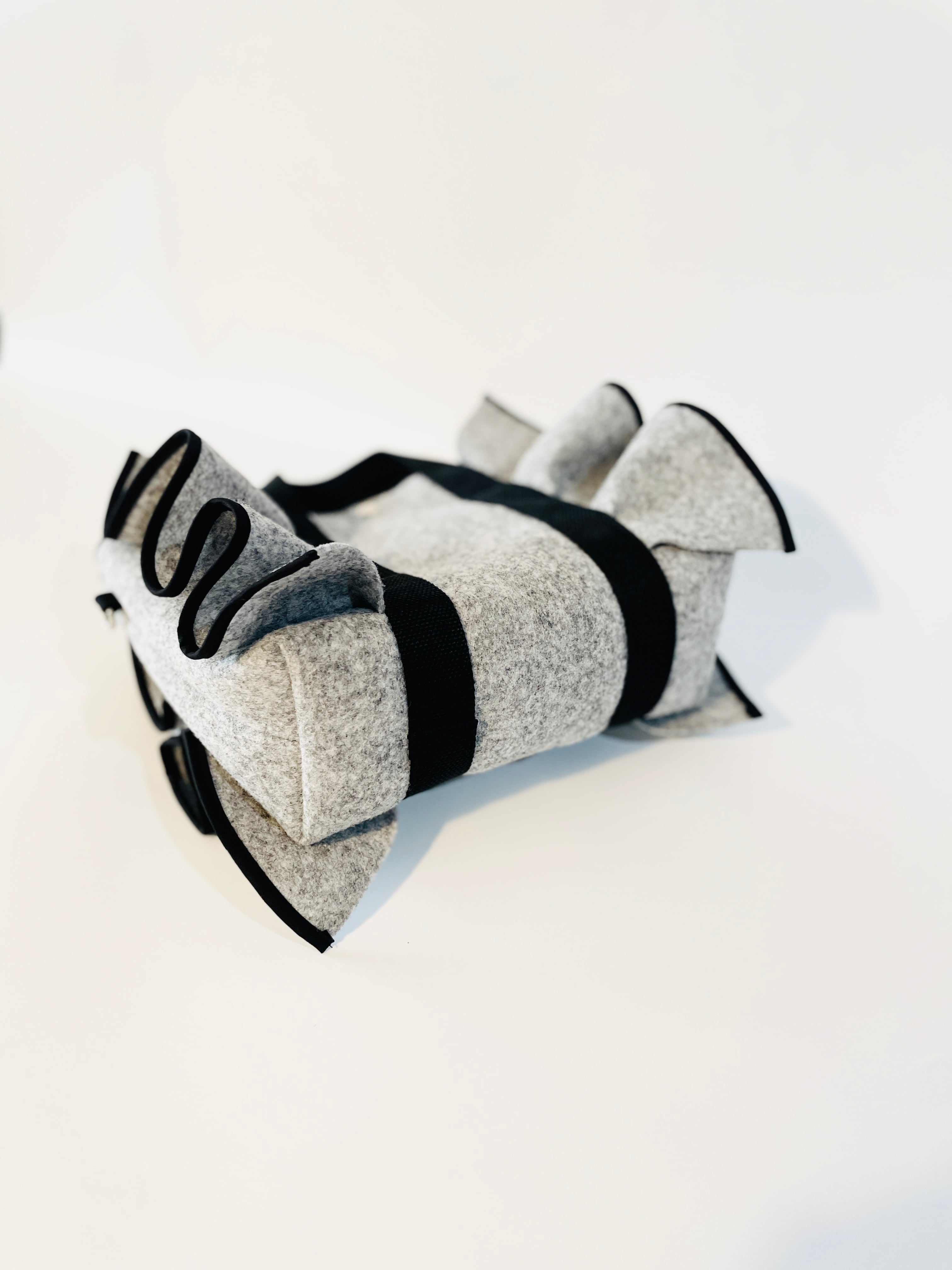 軽量かつ、ハリのある3mm厚圧縮フェルト生地で縦フリルをあしらいブラックベルトをぐるりと叩きつけたシックで存在感のあるデザインバッグです。