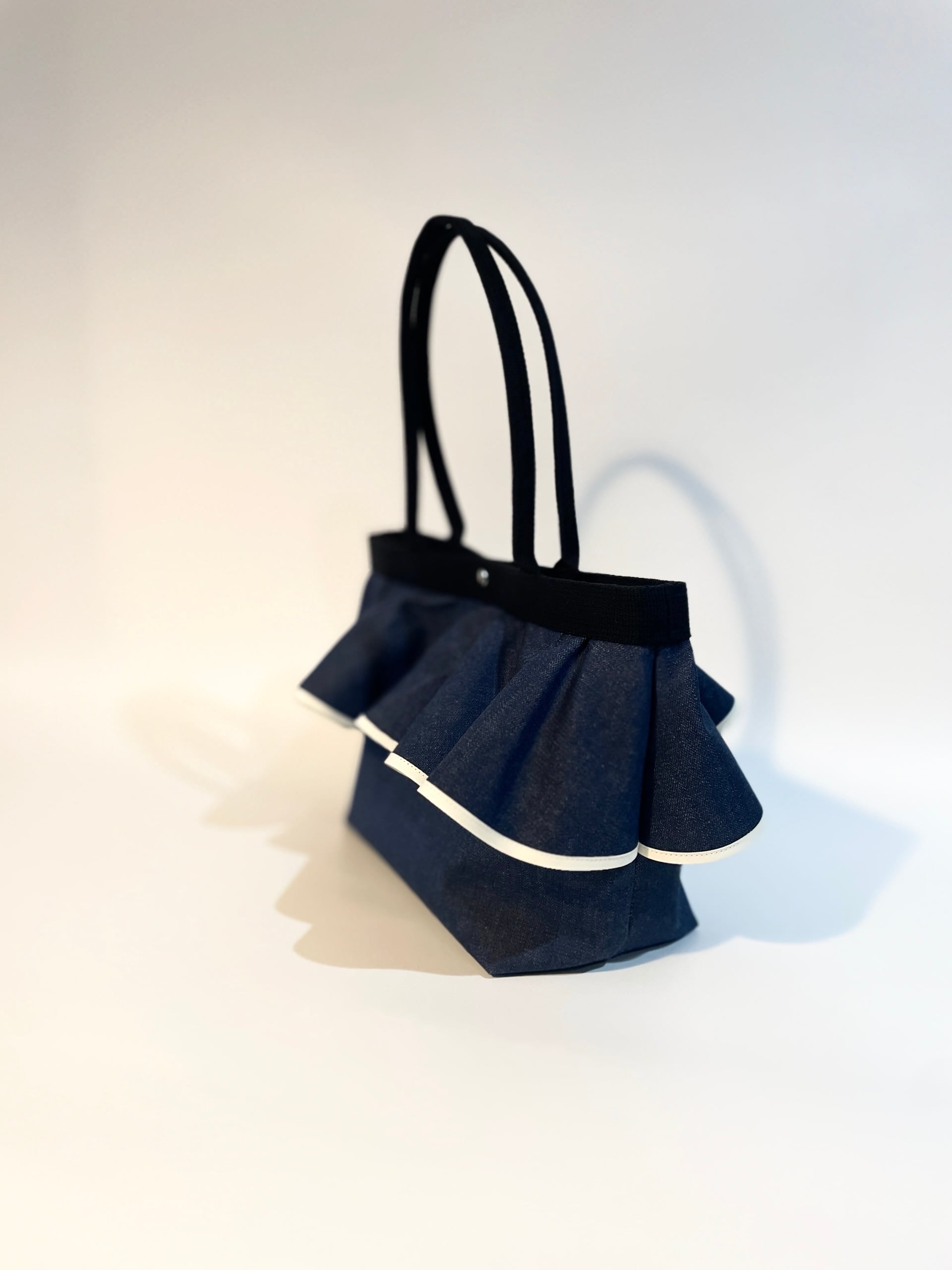 存在感、収納共にたっぷりな上品カジュアル大きめデニムフリルのトートバッグをつくりました。