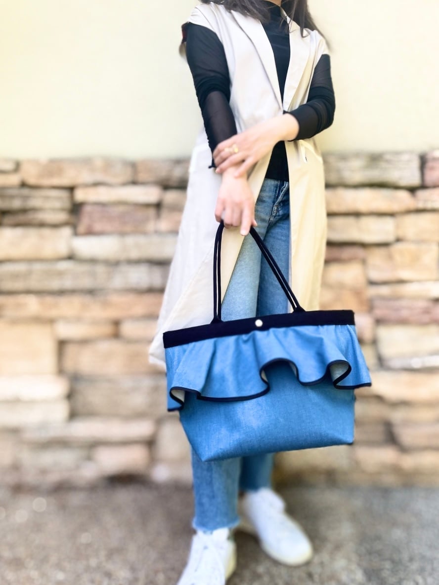 存在感、収納共にたっぷりな上品カジュアル大きめデニムフリルのトートバッグをつくりました。